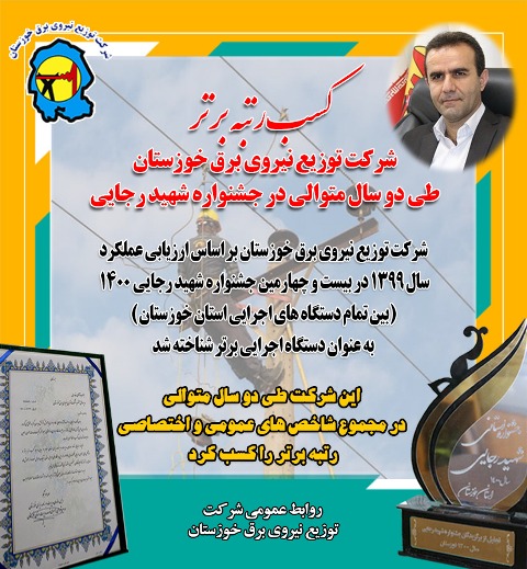 شرکت توزیع نیروی برق خوزستان رتبه برتر جشنواره شهید رجایی شد