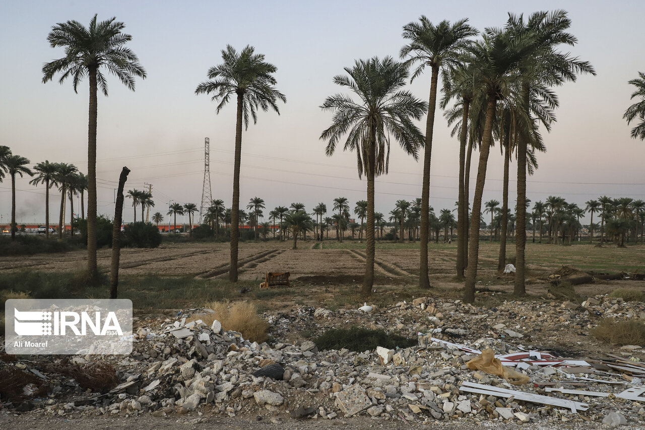 نخلستان‌هایی که به تدریج طعمه زمین‌خواران شده است. حالا دیگر چیزی از نخل‌های کوت عبدالله، ملاثانی، شیبان، چنیبه و گلستان باقی نمانده است. اکنون نوبت رسیده است به نخلستانی که در جنوب اهواز و پشت محله‌های مشعلی و اسلام آباد واقع است.دیوارهای بلوکی روی اجساد بیش از ۵۰ نفر نخل سوخته بالا می‌رود. انتهای کوی مشعلی، رو به ساحل کارون، حالا گور دسته جمعی نخل‌هایی است که کپه کپه روی هم دراز به دراز افتاده‌اند. ماده ۶۸۵ قانون مجازات اسلامی به صراحت، قطع کردن و خشکاندن نخل خرما را جرم دانسته است. طبق این ماده، «هر کس اصله نخل خرما را به هر ترتیب یا هر وسیله بدون مجوز قانونی از بین ببرد یا قطع کند به سه تا ۶ ماه حبس یا از یک میلیون و ۵۰۰ هزار تا سه میلیون ریال جزای نقدی یا هر دو مجازات محکوم خواهد شد».